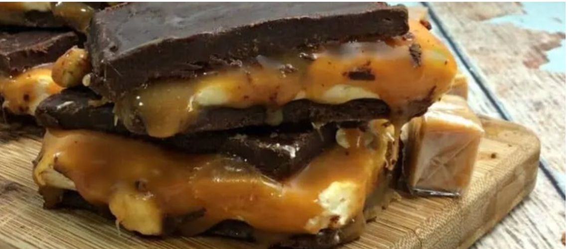 - Pour melted chocolate over cooled caramel and place into the refrigerator until hardened.