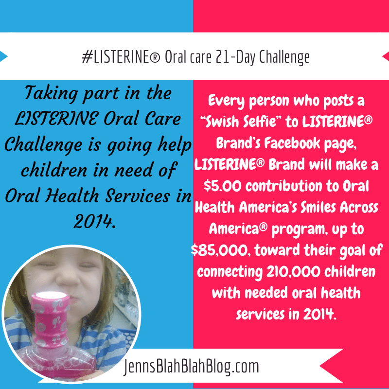 You can join us too, it’s super easy, healthy, and a great way to get your kids into healthy habits. Not only is LISTERINE® going to help keep your mouth healthy, they are also going to be helping children with oral health services in 2014! Taking part in the LISTERINE Oral Care Challenge is doing more than helping develop better brushing, flossing, and rinsing habits with LISTERINE®! It’s also going help children in need. For every person who posts a “Swish Selfie” to LISTERINE® Brand’s Facebook page, LISTERINE® Brand will make a $5.00 contribution to Oral Health America’s Smiles Across America® program, up to $85,000, toward their goal of connecting 210,000 children with needed oral health services in 2014.