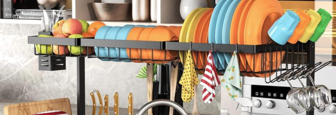 This PUSDON Over Sink Dish Rack is adjustable to fit your needs and fits sinks with a faucet height of 16.5 inches or less. This is a great way to save on counter space making organization and clean up easier. The water from the drying dishes will drip into the sink helping you keep your kitchen cleaner and more organized.